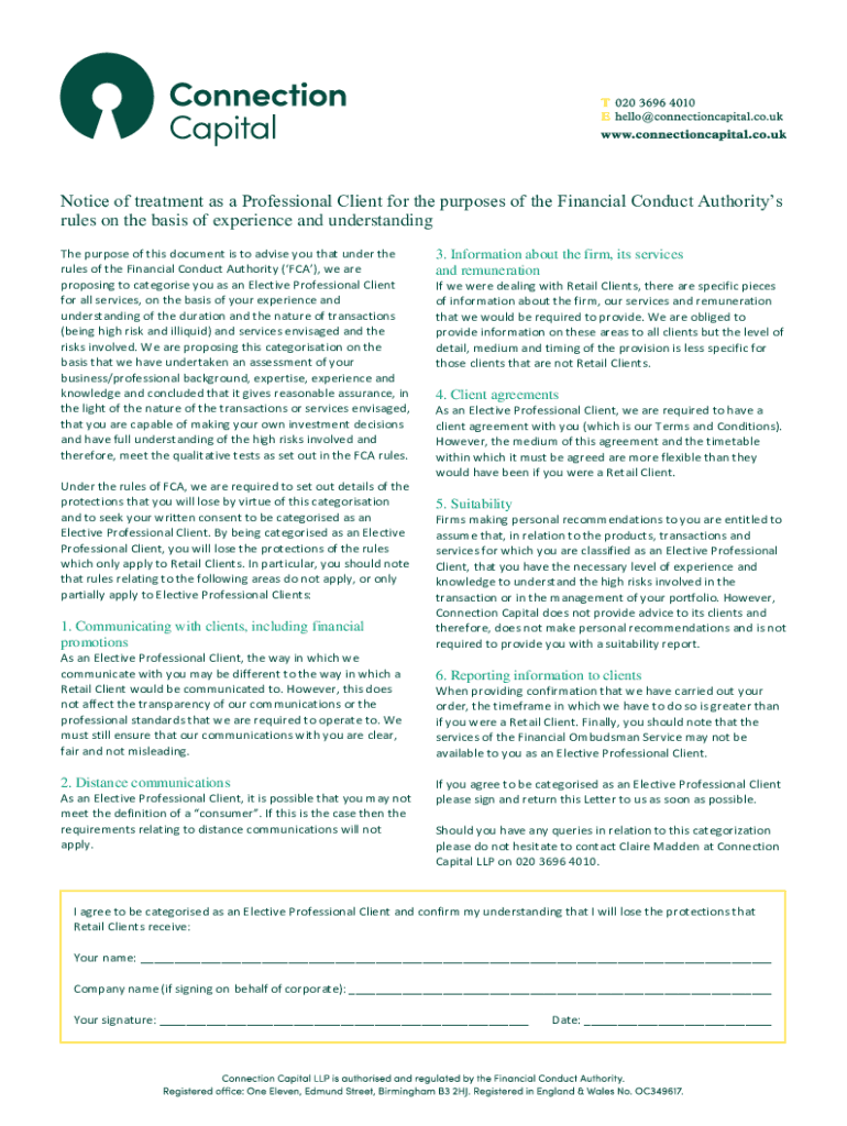 Notice of treatment as a Professional Client for the purposes of the Financial Conduct Authorities rules on the basis of experience and understanding The purpose of this document is to advise you