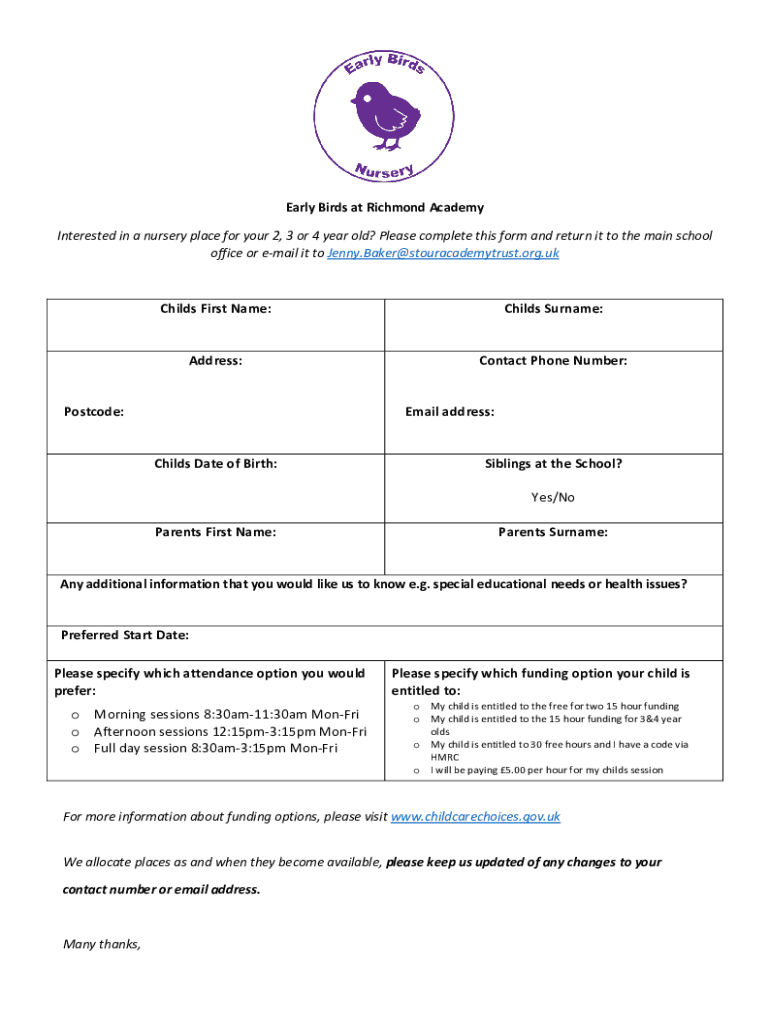 Early Birds at Richmond Academy Interested in a nursery place for your 2, 3 or 4-year-old? Please complete this form and return it to the main school office or email it to Jenny.Baker@stouracademytrust.org.ukChilds