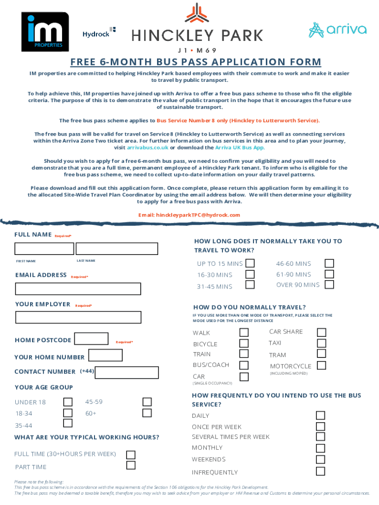 FREE 6MONTH BUS PASS APPLICATION FORM IM properties are committed to helping Hinckley Park based employees with their commute to work and make it easier to travel by public transport. To help achieve