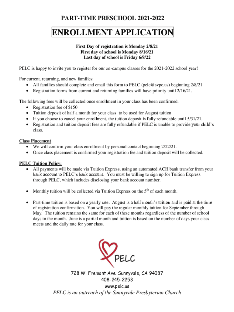 PART TIME PRESCHOOL 20212022ENROLLMENT APPLICATION First Day of registration is Monday 2/8/21 First day of school is Monday 8/16/21 Last day of school is Friday 6/9/22 PELT is happy to invite you