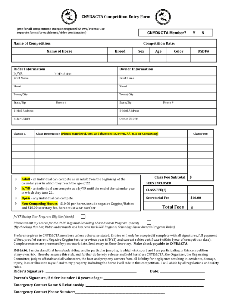 CNYD&CTA Competition Entry Form (Use for all competitions except Recognized Shows/Events; Use separate forms for each horse/rider combination)CNYD&CTA Member? Name of Competition: BreedSexColorUSDF#Owner