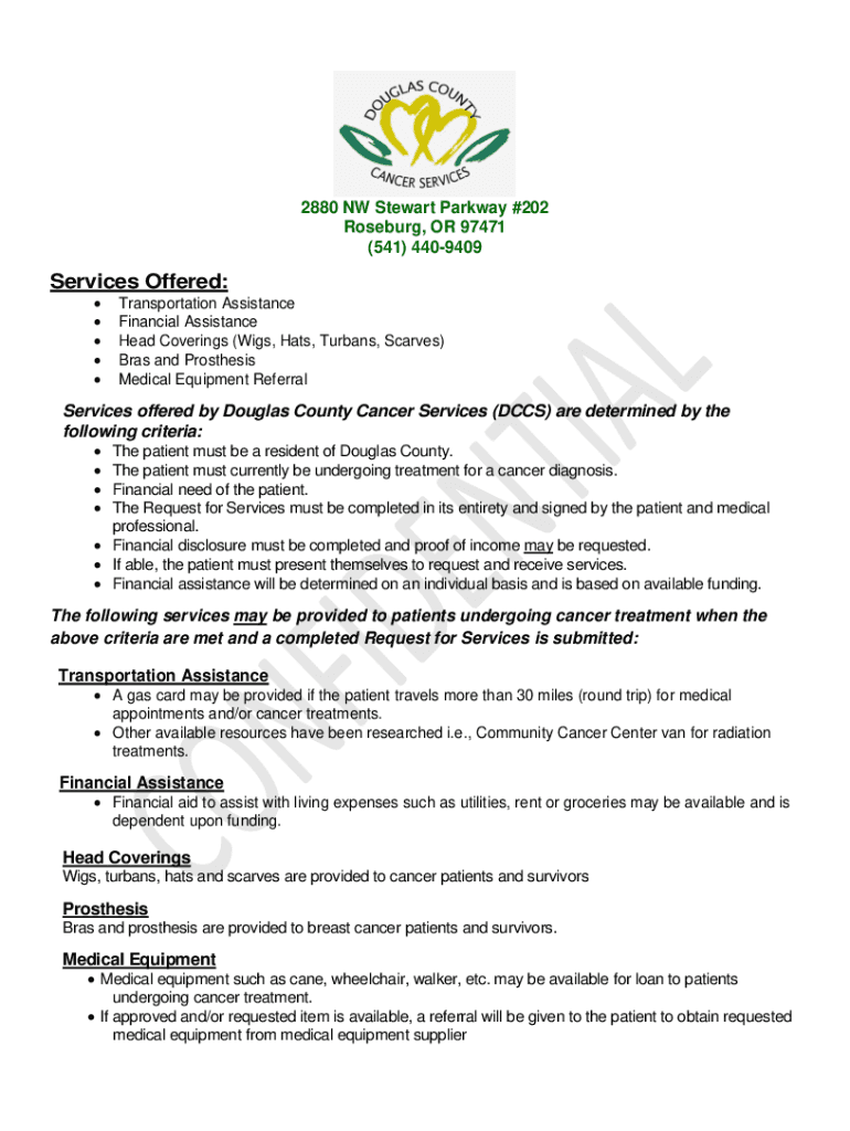 2880 NW Stewart Parkway #202 Roseburg, OR 97471 (541) 4409409Services Offered: Transportation Assistance Financial Assistance Head Coverings (Wigs, Hats, Turbans, Scarves) Bras and Prosthesis Medical