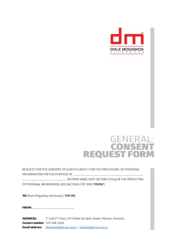GENERAL: CONSENT REQUEST FORM REQUEST FOR THE CONSENT OF A DATA SUBJECT FOR THE PROCESSING OF PERSONAL INFORMATION FOR THE PURPOSE OF IN COMPLIANCE WITH SECTION 11 (1) (a) OF THE PROTECTION OF PERSONAL