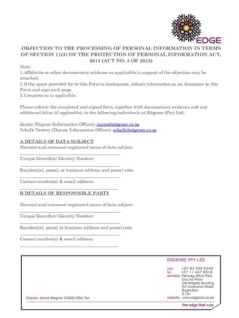 Get the free OBJECTION TO THE PROCESSING OF PERSONAL ... - edgexec.co.za