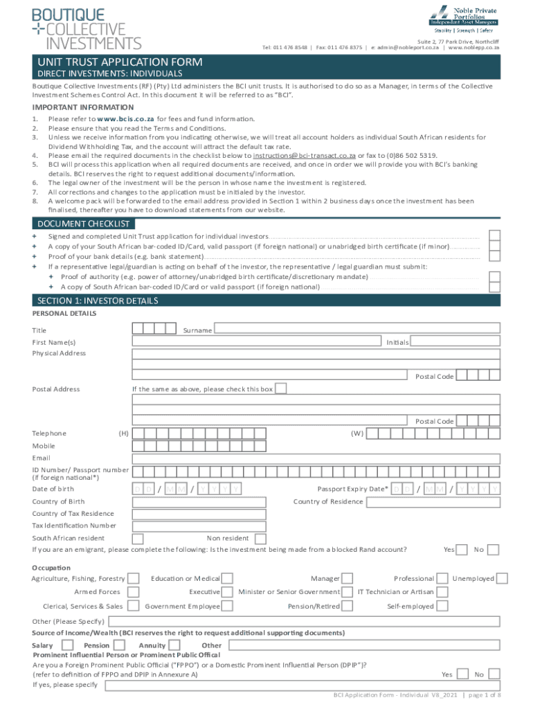 Suite 2, 77 Park Drive, North cliff Tel: 011 476 8548 Fax: 011 476 8375 e: admin noble port.co.ZA www.noblepp.co.zaUNIT TRUST APPLICATION FORM DIRECT INVESTMENTS: INDIVIDUALSBoutique Collective Investments