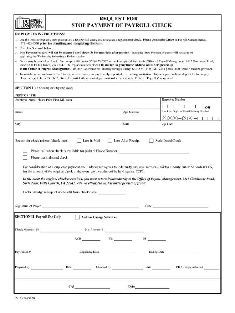 REQUEST FOR STOP PAYMENT OF PAYROLL CHECK EMPLOYEES INSTRUCTIONS: 1. Use this form to request a stop payment on a lost payroll check and to request a replacement check. Please contact the Office of