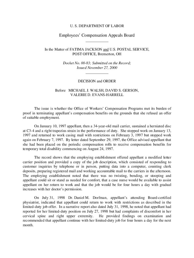 U. S. DEPARTMENT OF LABOREmployees Compensation Appeals Board In the Matter of FATIMA JACKSON and U.S. POSTAL SERVICE, POST OFFICE, Bremerton, OH Docket No. 0083; Submitted on the Record; Issued November