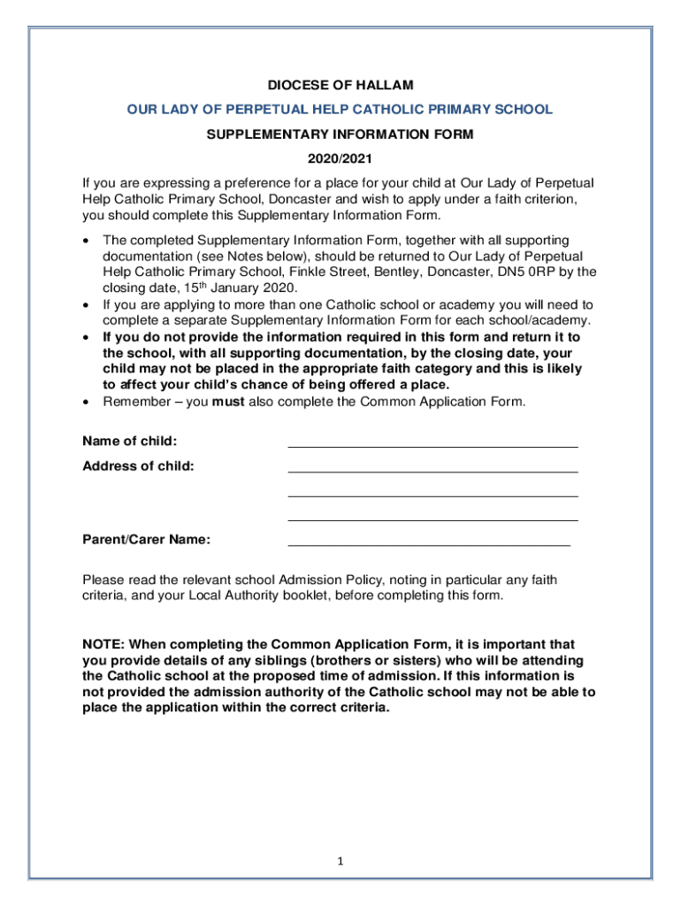 DIOCESE OF HALL AM OUR LADY OF PERPETUAL HELP CATHOLIC PRIMARY SCHOOL SUPPLEMENTARY INFORMATION FORM 2020/2021 If you are expressing a preference for a place for your child at Our Lady of Perpetual