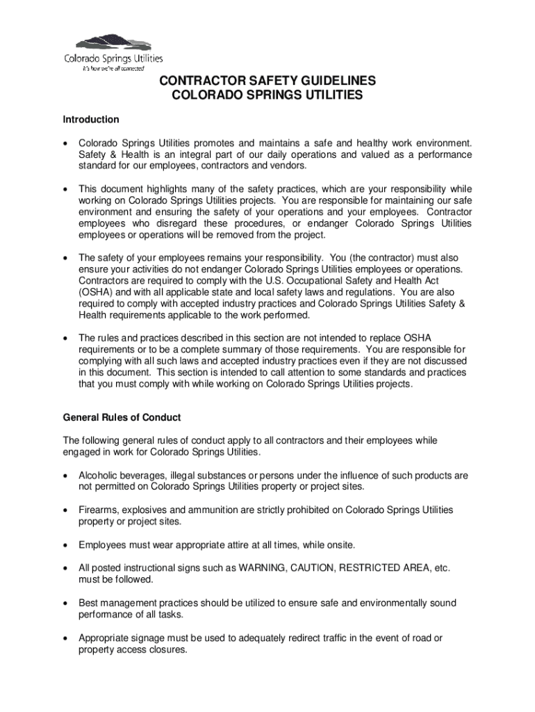 CONTRACTOR SAFETY GUIDELINES COLORADO SPRINGS UTILITIES Introduction Colorado Springs Utilities promotes and maintains a safe and healthy work environment. Safety & Health is an integral part of our