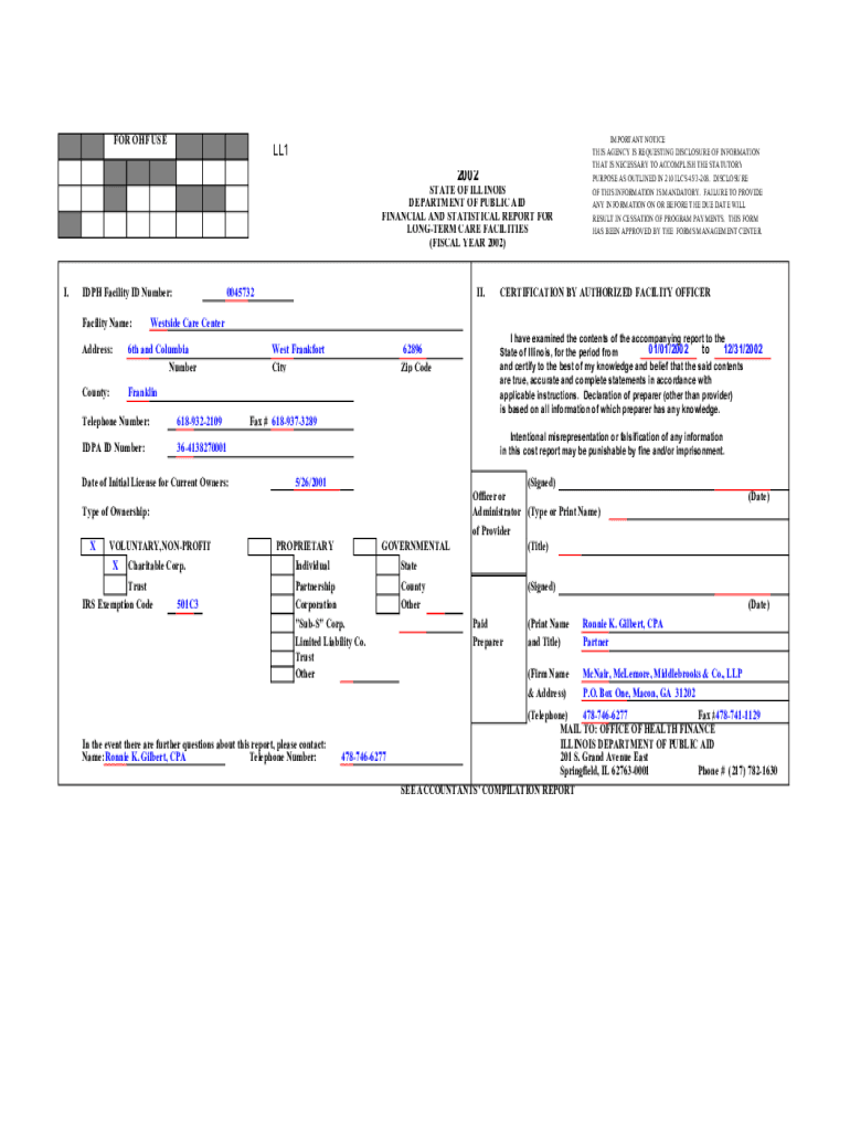 FOR OF USELL1 2002STATE OF ILLINOIS DEPARTMENT OF PUBLIC AID FINANCIAL AND STATISTICAL REPORT FOR LONGER CARE FACILITIES (FISCAL YEAR 2002)I.DPH Facility ID Number: Facility Name:0045732II.CERTIFICATION
