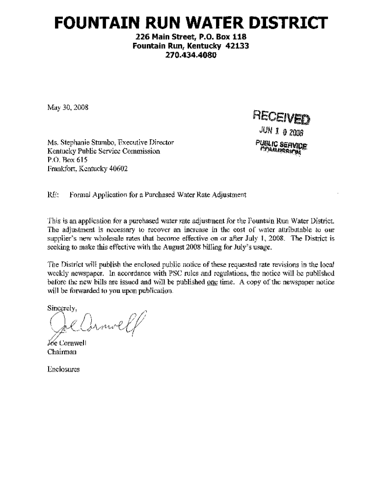 FOUNTAIN RUN WATER DISTRICT 226 Main Street, P.O. Box 118 Fountain Run, Kentucky 42133 270.434.4080May 30,2008Ms. Stephanie Studio, Executive Director Kentucky Public Service Commission P.O. Box 615