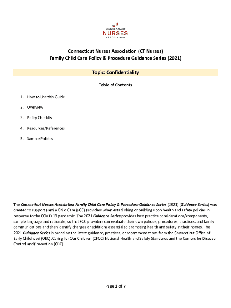Connecticut Nurses Association (CT Nurses) Family Child Care Policy & Procedure Guidance Series (2021) Topic: Confidentiality Table of Contents 1. How to Use this Guide 2. Overview 3. Policy Checklist