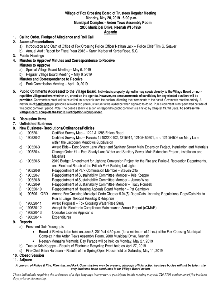 Village of Fox Crossing Board of Trustees Regular Meeting Monday, May 20, 2019 6:00 p.m. Municipal Complex Arden Too Assembly Room 2000 Municipal Drive, Née nah WI 54956Agenda1. Call to Order, Pledge
