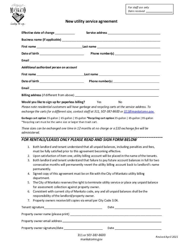 Get the free New utility service agreement FOR RENTALS/LEASES ONLY ...