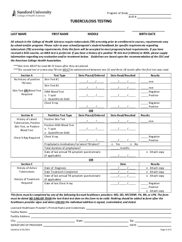 Program of StudyTUBERCULOSIS TESTING LAST NAME FIRST NAME MIDDLES # BIRTH Catcall schools in the College of Health Sciences require tuberculosis (TB) screening prior to enrollment in courses, requirements