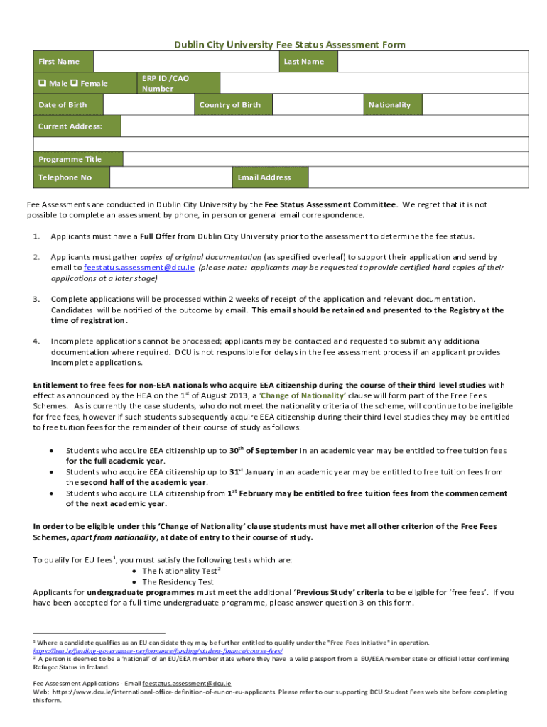 Get the free Dublin City University Fee Status Assessment Form - dcu.ie