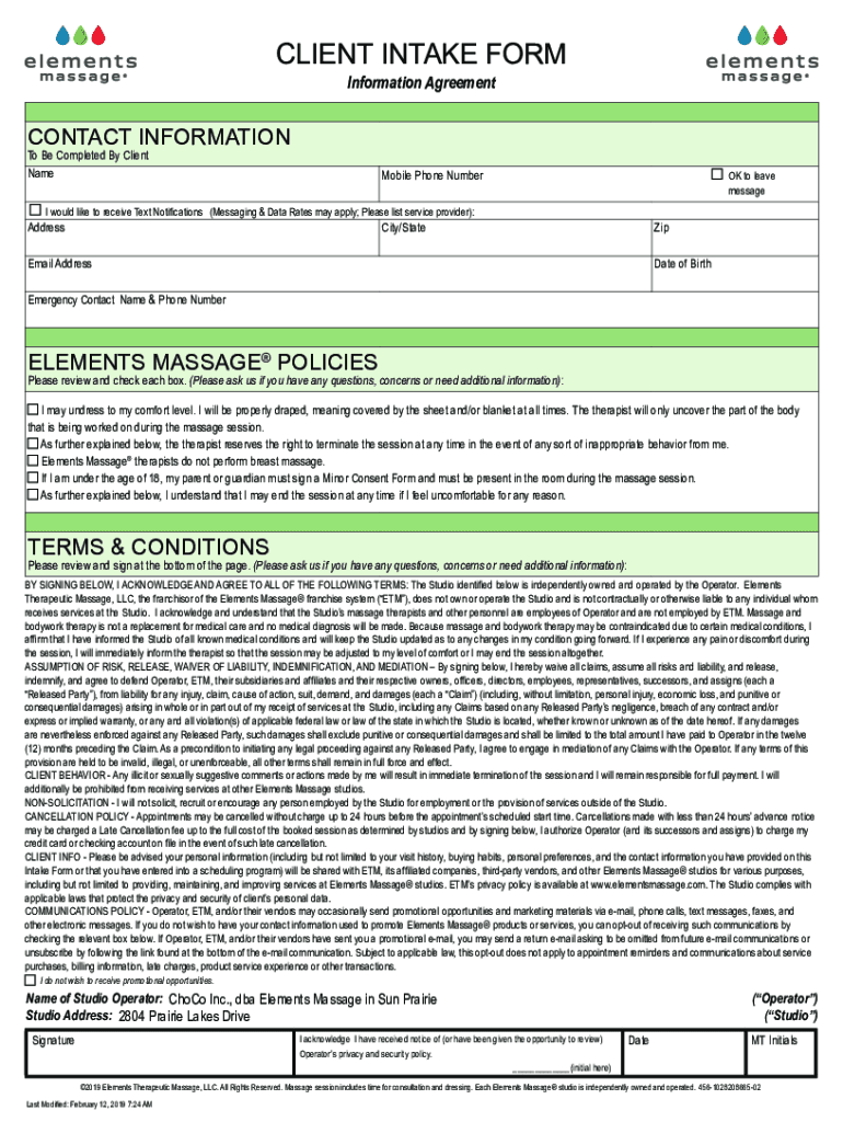 CLIENT INTAKE FORM Information AgreementCONTACT INFORMATION To Be Completed By Client Name Mobile Phone Number OK to leave message would like to receive Text Notifications (Messaging & Data Rates