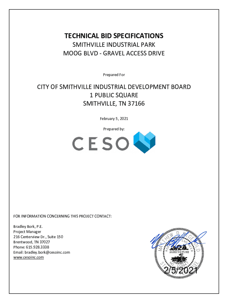 TECHNICAL BID SPECIFICATIONS SMITHVILLE INDUSTRIAL PARK MOOG BLVD GRAVEL ACCESS DRIVE Prepared Forcing OF SMITHVILLE INDUSTRIAL DEVELOPMENT BOARD 1 PUBLIC SQUARE SMITHVILLE, TN 37166 February 5, 2021,