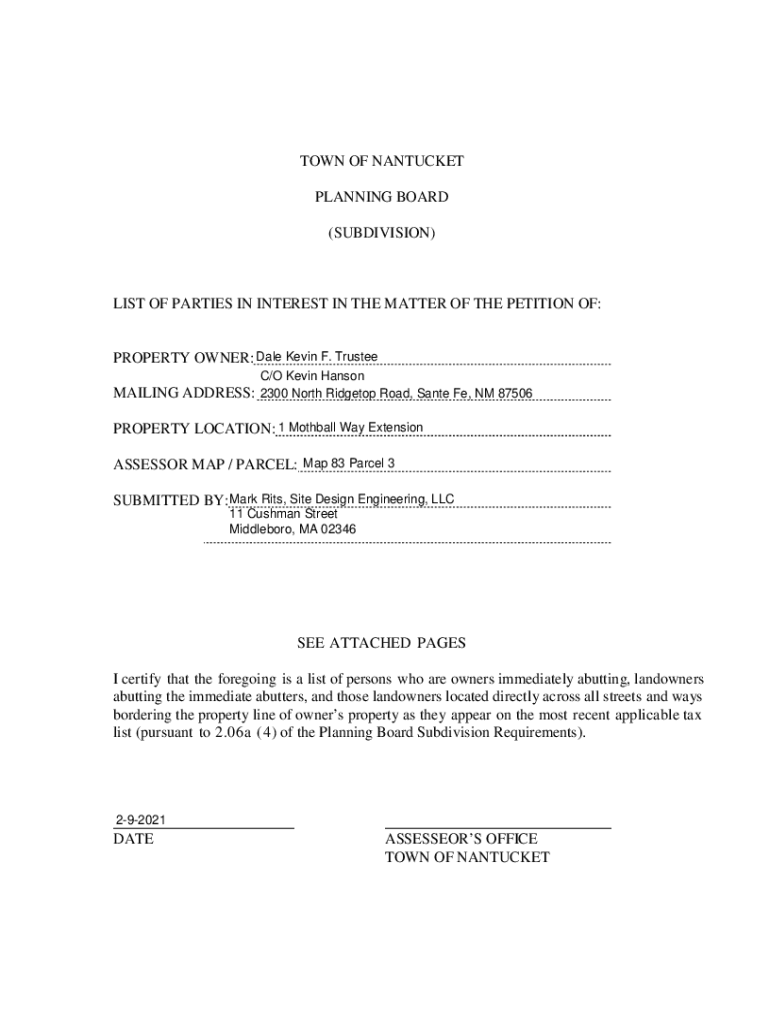 AR Subdivision Modification 281 Hummock Pond Nominee Trust, William Hunter, Trustee & 273 Hummock Pond Nominee Trust, Kevin Dale, Trustee 1 & 3 Mothball Wayside DESIGN ENGINEERING, LLC. 11 Cushman