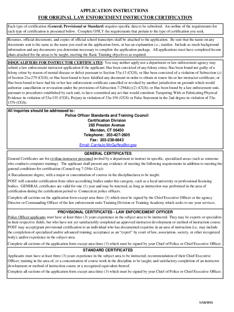 APPLICATION INSTRUCTIONS FOR ORIGINAL LAW ENFORCEMENT INSTRUCTOR CERTIFICATION Each type of certification (General, Provisional or Standard) requires specific data to be submitted. An outline of the