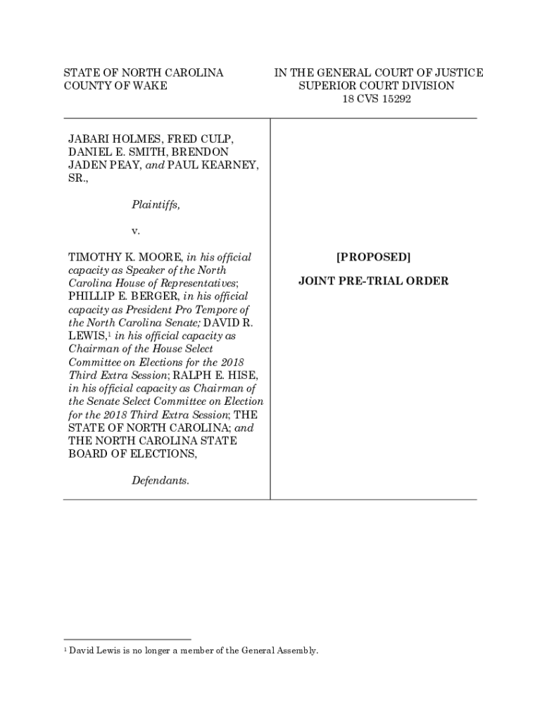 STATE OF NORTH CAROLINA COUNTY OF WAKEN THE GENERAL COURT OF JUSTICE SUPERIOR COURT DIVISION 18 CVS 15292JABARI HOLMES, FRED CULT, DANIEL E. SMITH, BRENDON JADEN PLAY, and PAUL KEARNEY, SR., Plaintiffs,