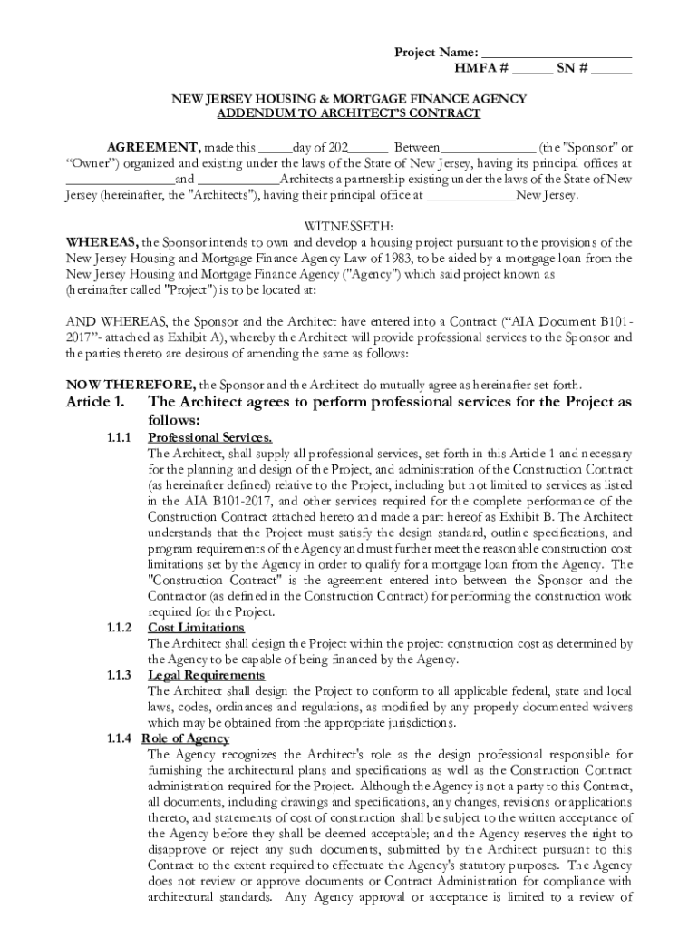 Project Name: MFA # SN # NEW JERSEY HOUSING & MORTGAGE FINANCE AGENCY ADDENDUM TO ARCHITECTS CONTRACTAGREEMENT, made this day of 202 Between (the “Sponsor or Owner) organized and existing under