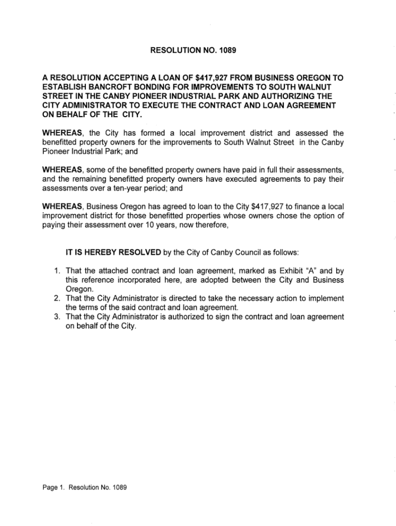 RESOLUTION NO. 1089A RESOLUTION ACCEPTING A LOAN OF $417,927 FROM BUSINESS OREGON TO ESTABLISH BANCROFT BONDING FOR IMPROVEMENTS TO SOUTH WALNUT STREET IN THE CANDY PIONEER INDUSTRIAL PARK AND AUTHORIZING