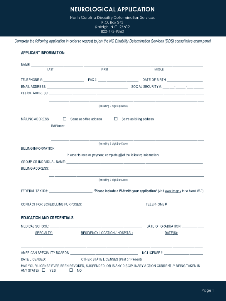 NEUROLOGICAL APPLICATION North Carolina Disability Determination Services P.O. Box 243 Raleigh, N.C. 27602 8004439360Complete the following application in order to request to join the NC Disability
