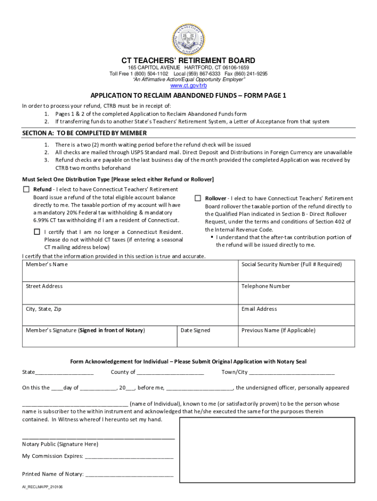 CT TEACHERS RETIREMENT BOARD 165 CAPITOL AVENUE HARTFORD, CT 061061659 Toll Free 1 (800) 5041102 Local (959) 8676333 Fax (860) 2419295 An Affirmative Action/Equal Opportunity Employerwww.ct.gov/trbAPPLICATION