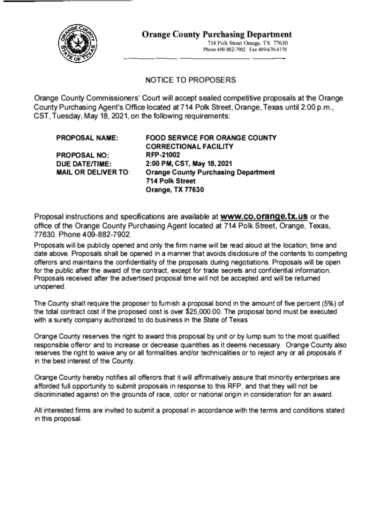 Orange County Purchasing Department 714 Polk Street Orange, TX 77630 Phone 4098827902 Fax 4096704170NOTICE TO PROPOSERS Orange County Commissioners\' Court will accept sealed competitive proposals