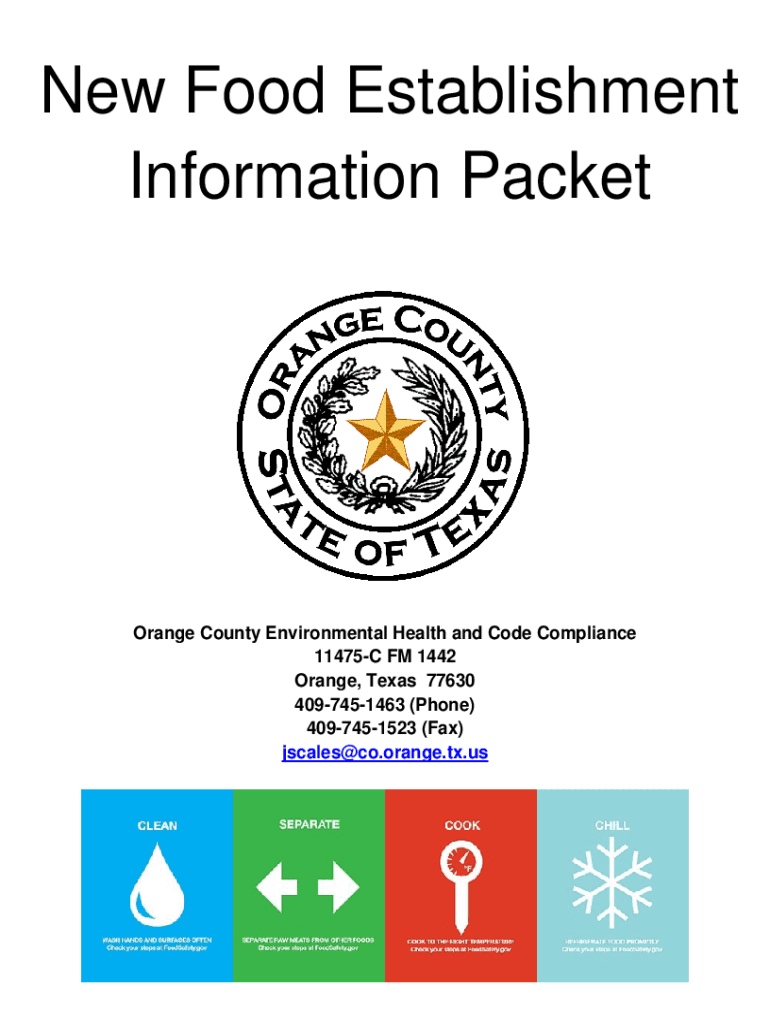New Food Establishment Information Packet Orange County Environmental Health and Code Compliance 11475C FM 1442 Orange, Texas 77630 4097451463 (Phone) 4097451523 (Fax) jscales@co.orange.tx.usWe are