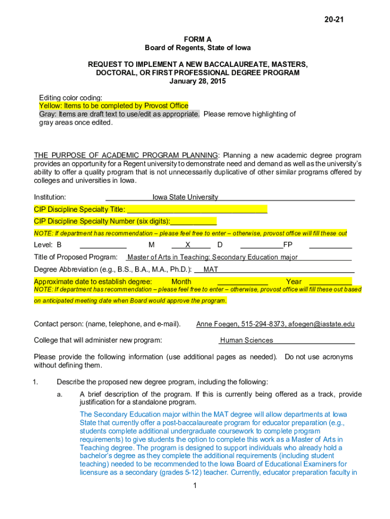 2021 FORM A Board of Regents, State of Iowa REQUEST TO IMPLEMENT A NEW BACCALAUREATE, MASTERS, DOCTORAL, OR FIRST PROFESSIONAL DEGREE PROGRAM January 28, 2015, Editing color coding: Yellow: Items