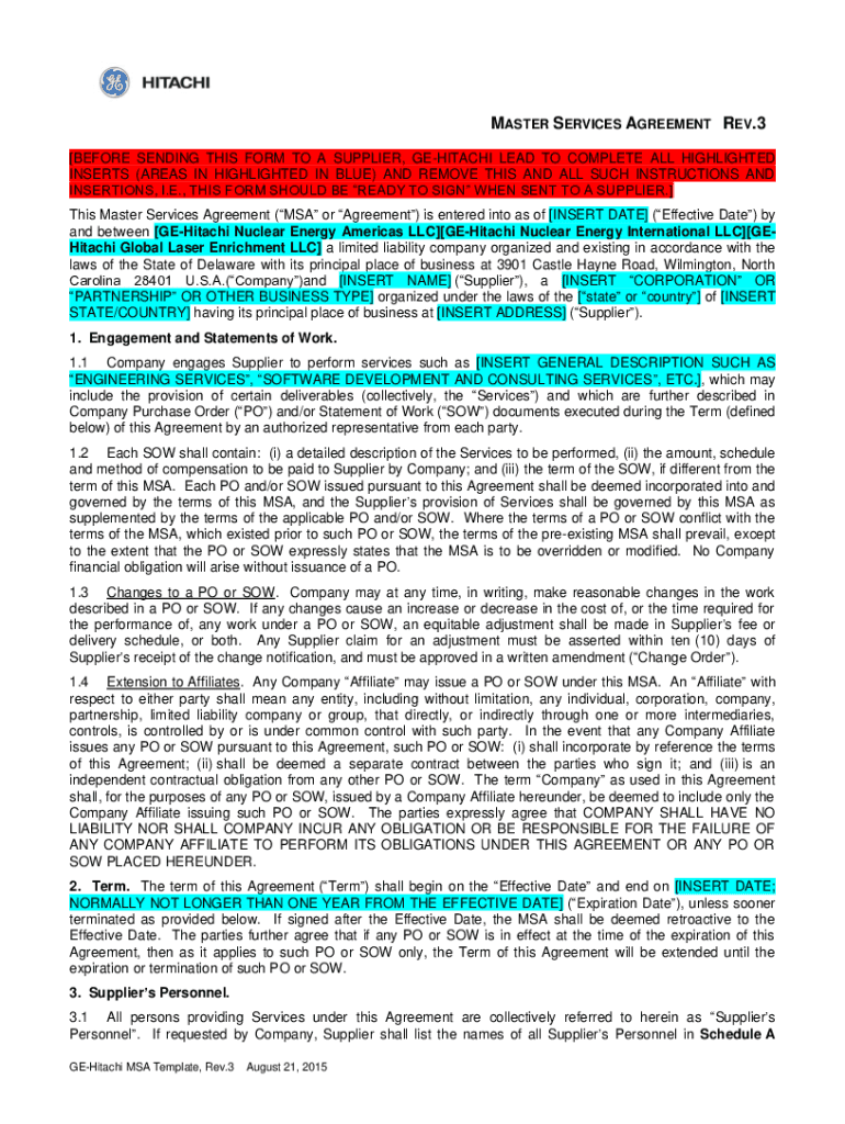 MASTER SERVICES AGREEMENT REV.3 BEFORE SENDING THIS FORM TO A SUPPLIER, HITACHI LEAD TO COMPLETE ALL HIGHLIGHTED INSERTS (AREAS IN HIGHLIGHTED IN BLUE) AND REMOVE THIS AND ALL SUCH INSTRUCTIONS AND