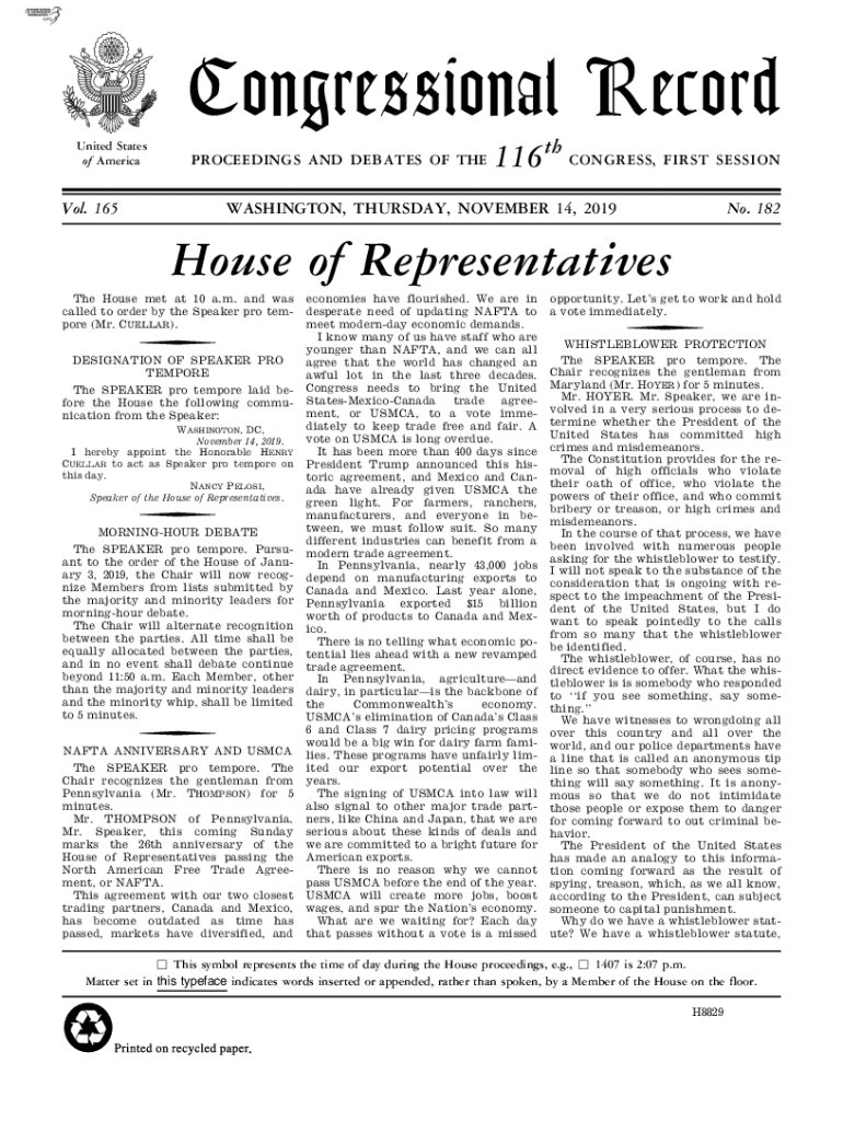 RIB DUE PLNUCongressional RecordMSUnited States of AmericaPROCEEDINGS AND DEBATES OF Trevor. 165116 TH CONGRESS, FIRST SESSIONWASHINGTON, THURSDAY, NOVEMBER 14, 2019No. 182House of Representatives