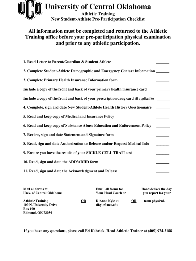 University of Central Oklahoma Athletic Training New StudentAthlete Participation Checklist information must be completed and returned to the Athletic Training office before your participation physical