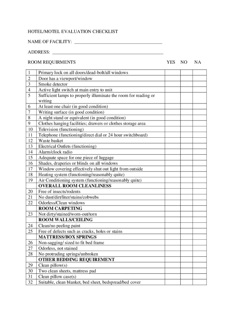 HOTEL/MOTEL EVALUATION CHECKLIST NAME OF FACILITY: ADDRESS: ROOM REQUIREMENTS 1 2 3 4 5 6 7 8 9 10 11 12 13 14 15 16 17 18 19 20 21 22 23 24 25 26 27 28 29 30 31 32Primary lock on all doors/deadbolt/all