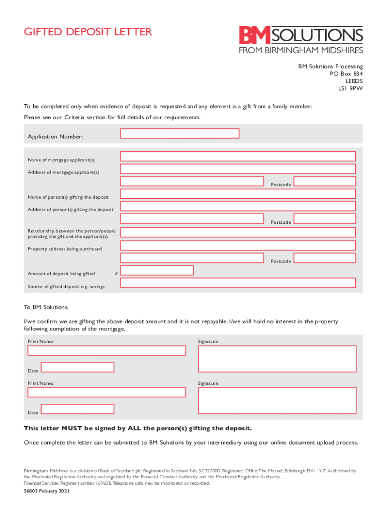 GIFTED DEPOSIT LETTER BM Solutions Processing PO Box 834 LEEDS LS1 9PW To be completed only when evidence of deposit is requested and any element is a gift from a family member. Please see our Criteria