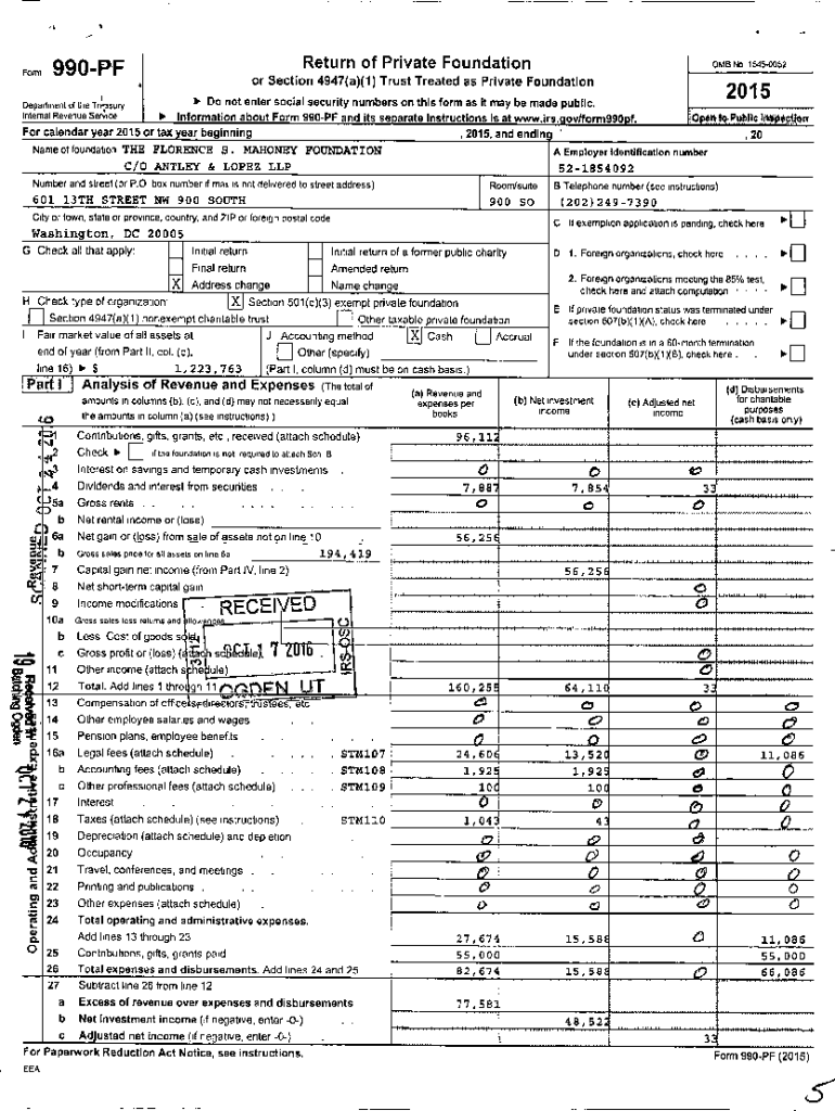 .1FormReturn of Private Foundation990 PF OMB No 15450052or Section 4947(a)(1) Trust Treated as Private Foundation42015 Do not enter social security numbers on this form as it may be made public. Internal