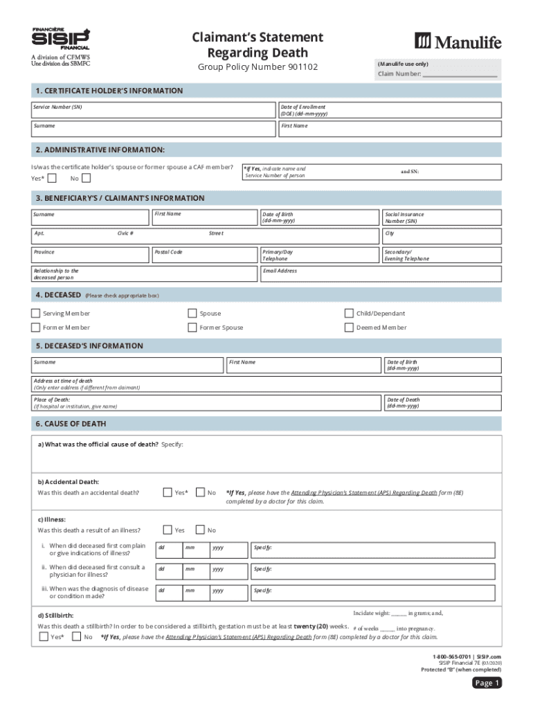 SAVE Claimants Statement Regarding Death Group Policy Number 901102PRINTRESET(Manlike use only)Claim Number:1. CERTIFICATE HOLDERS INFORMATION Service Number (SN)Date of Enrollment (DOE) (ddmmyyyy)SurnameFirst