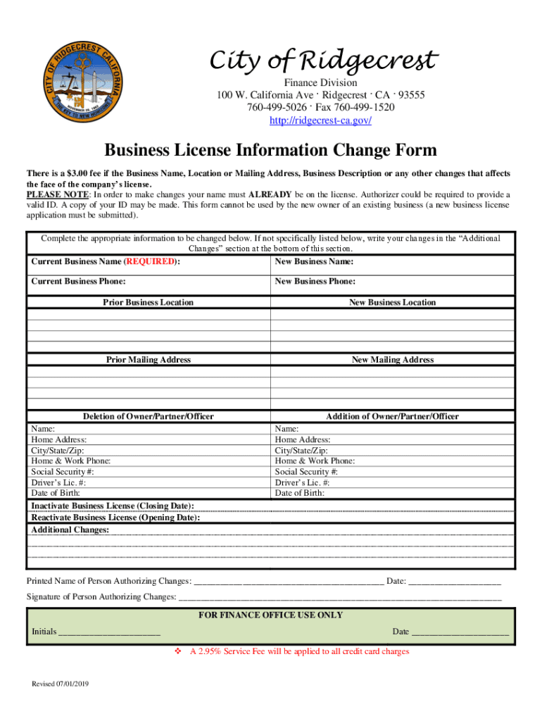 City of Ridge crest Finance Division 100 W. California Ave Ridge crest CA 93555 7604995026 Fax 7604991520 http://ridgecrestca.gov/Business License Information Change Form There is a $3.00 fee if the