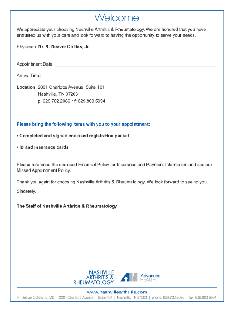 Welcome We appreciate your choosing Nashville Arthritis & Rheumatology. We are honored that you have entrusted us with your care and look forward to having the opportunity to serve your needs. Physician: