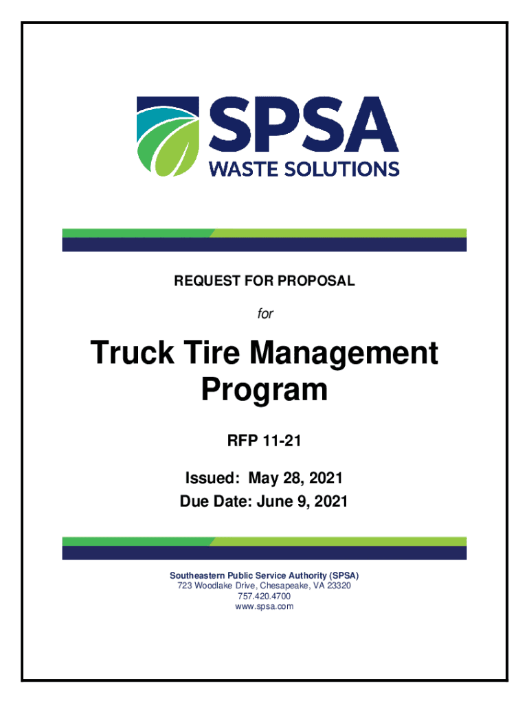 REQUEST FOR PROPOSAL firetruck Tire Management Program RFP 1121 Issued: May 28, 2021, Due Date: June 9, 2021Southeastern Public Service Authority (SPA) 723 Wood lake Drive, Chesapeake, VA 23320 757.420.4700