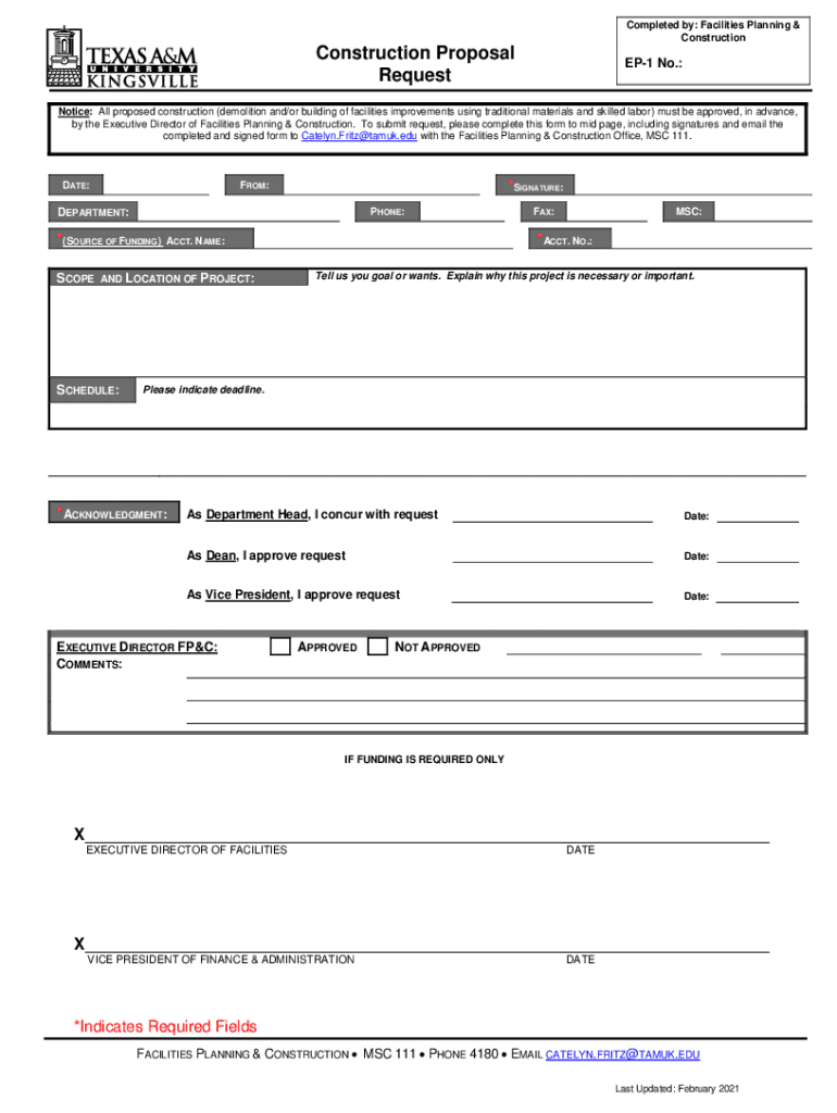 Completed by: Facilities Planning & ConstructionConstruction Proposal RequestEP1 No.:Notice: All proposed construction (demolition and/or building of facilities improvements using traditional materials