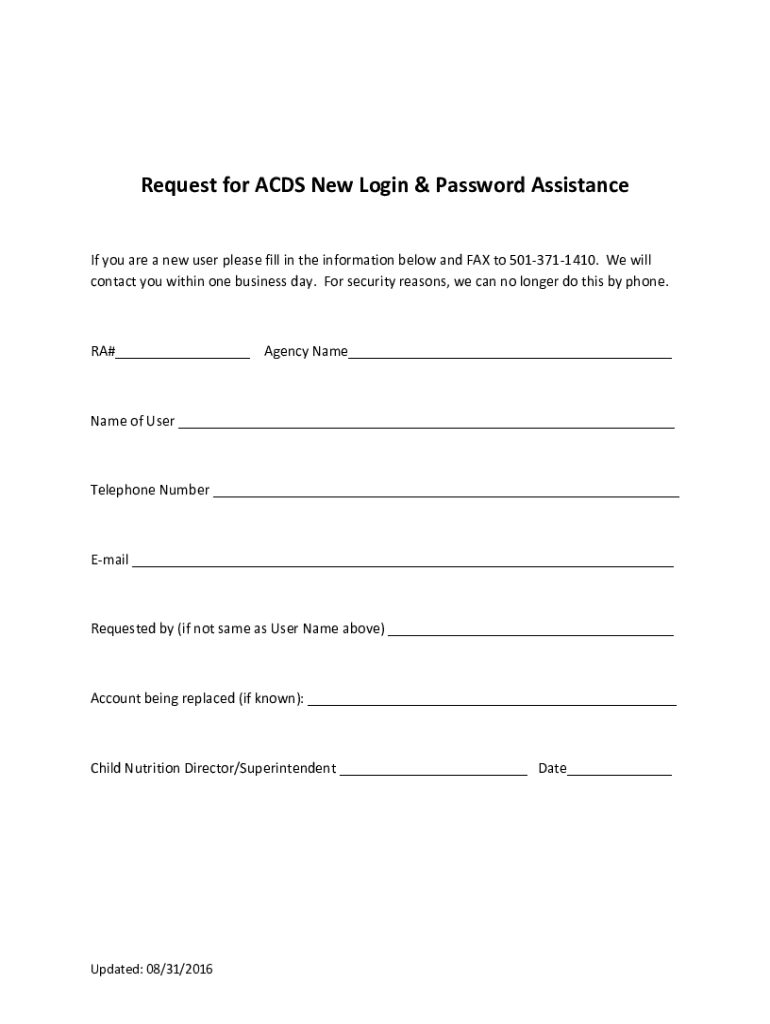 RequestforACDSNewLogin&PasswordAssistance IfyouareanewuserpleasefillintheinformationbelowandFAXto5013711410. Weill contactyouwithinonebusinessday. Forsecurityreasons, wecannolongerdothisbyphone. RA#