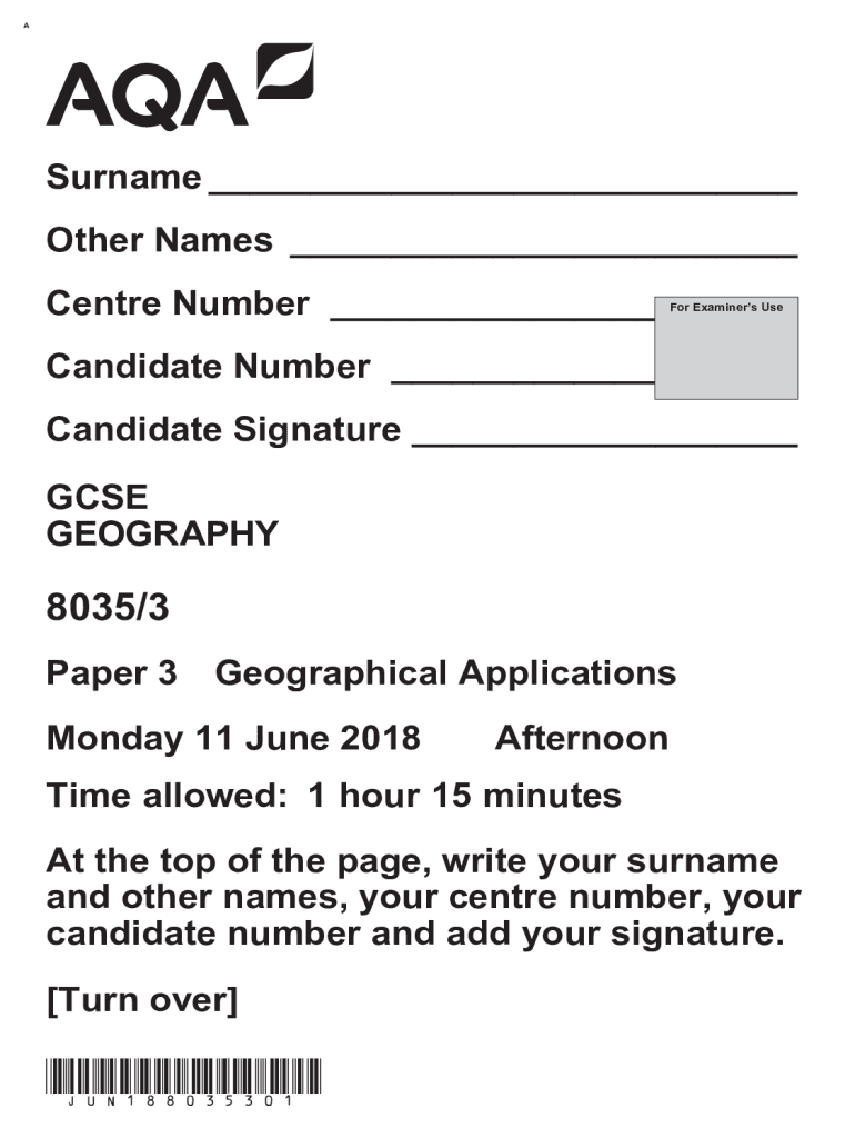 Surname Other Names Center Number For Examiners Candidate Number Candidate Signature GCSE GEOGRAPHY8035/3 Paper 3Geographical Applications Monday 11 June 2018AfternoonTime allowed: 1 hour 15 minutes