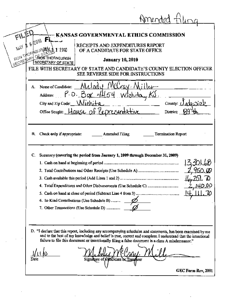I.LR.SAS GOVERNMENTAL12010.ETHICS Commission RECEIPTS AND EXPENDITURES REPORT 1 OF A CANDIDATE FOR STATE OFFICE January 10,2010A.MDR “I+J Address: D. furl, l dJ1leh...’t, .;A 'FLL. Jo. W Name