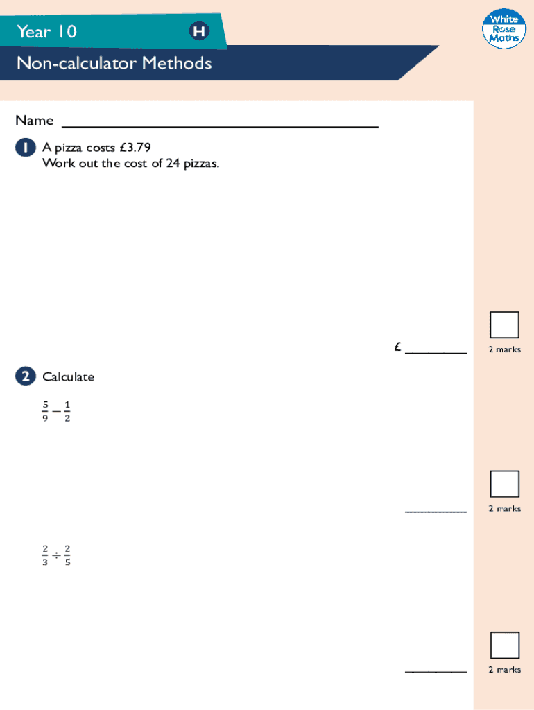Year 10HNoncalculator Methods Name 1 A pizza costs 3.79Work out the cost of 24 pizzas. 2 marks 2 marks 2 marks2 Calculate 5 92 31 22 53 Work out an estimate for the value of43 28 0.52 2 marks4 A family