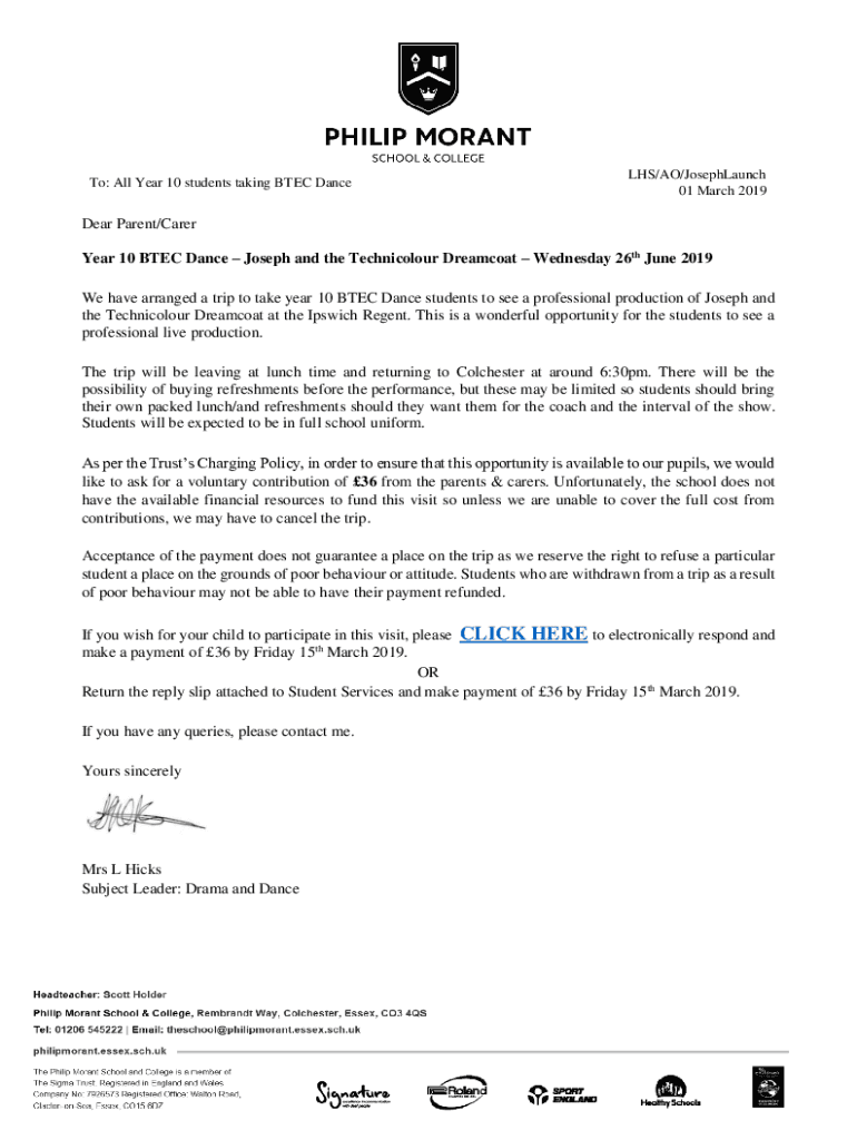 To: All Year 10 students taking BTEC Dance LHS/AO/JosephLaunch 01 March 2019Dear Parent/Carer Year 10 BTEC Dance Joseph and the Technicolor Dreamboat Wednesday 26th June 2019 We have arranged a trip