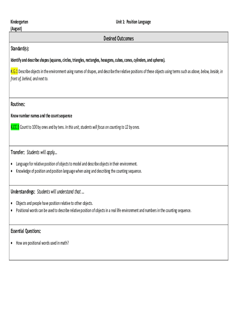 Kindergarten (August)Unit 1: Position LanguageDesired Outcomes Standard(s): Identify and describe shapes (squares, circles, triangles, rectangles, hexagons, cubes, cones, cylinders, and spheres).