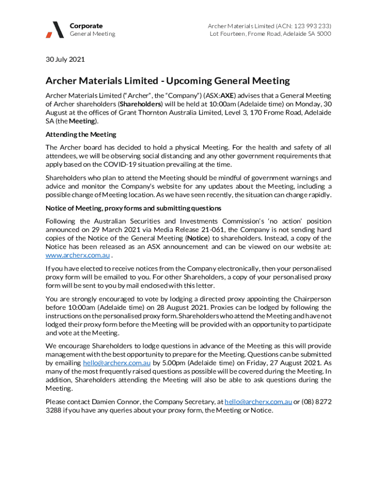 Corporate General MeetingArcher Materials Limited (ACN: 123 993 233) Lot Fourteen, From Road, Adelaide SA 500030 July 2021Archer Materials Limited Upcoming General Meeting Archer Materials Limited